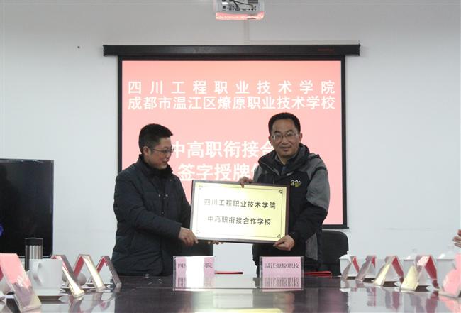 为构建现代职业教育体系,建立内部衔接、外部对接、多元立交的人才培养路径,增强职业教育特别是中等职业教育吸引力,为职教学生打造终身发展、全面发展的技能和知识基础,继我区燎原职业技术学校与成都职业技术学院、成都农业科技职业学院、乐山职业技术学院等高职院校开展中高职衔接合作之后,2017年3月9日,四川工程技术职业学院中高职衔接合作学校授牌仪式在燎原职业技术学校举行,四川工程职院与该校就中高职衔接达成合作协议,在专业领域开展教育教学中高职一体化衔接工作。