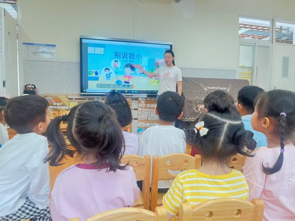 活动以“儿歌话普”为起点,聚焦幼儿语言感知能力培养。教师以《别说我小》儿歌为载体,通过色彩鲜明的图片帮助幼儿理解儿歌内容,搭配拍手、点头等简单肢体动作,引导幼儿逐句表达。生动的画面与趣味的动作相结合,让幼儿在轻松氛围中初步掌握儿歌节奏,为后续普通话学习打下基础。
