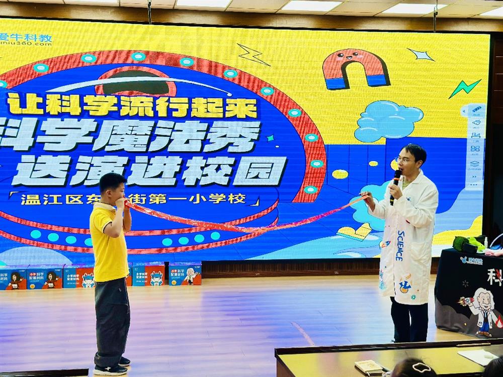 2025年9月28日,温江区东大街第一小学阶梯教室内掌声雷动、惊叹连连,一场以“让科学流行起来”为主题的科学魔法秀活动在此精彩上演。