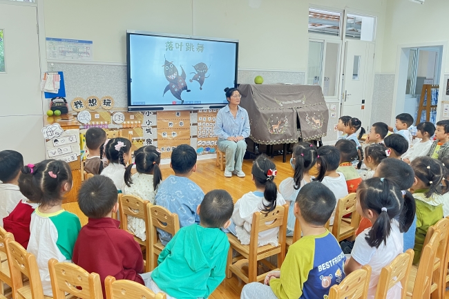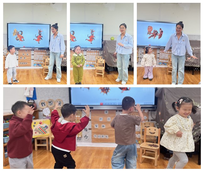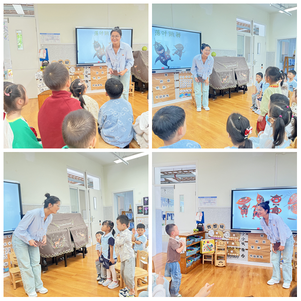 孩子们跟随着绘本《落叶跳舞》,进入了静悄悄的秋日树林。他们看到了落叶们“沙沙沙”地随风起舞,“忽地飘向远方”,又“哗地散开去”。故事中,落叶被赋予了生命与情感,它们自由地滑行、欢快地旋转,那热烈而美妙的舞姿深深吸引着每一位孩子。在“你来模仿”的互动环节中,孩子们纷纷化身小落叶,用稚拙而可爱的肢体语言,表现着树叶飘落的轻盈与快乐,教室里充满了欢声笑语。