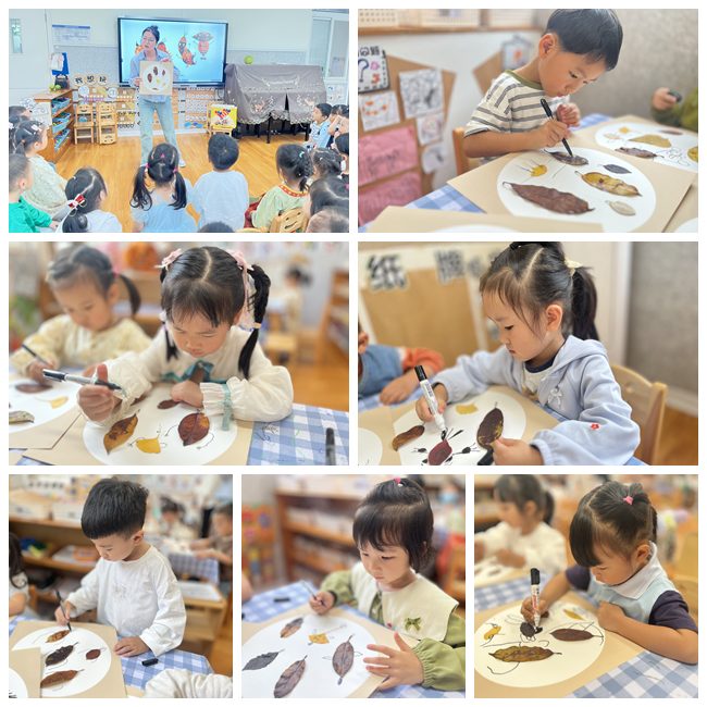 活动在轻松愉快的谈话中拉开序幕。“树叶有什么变化?”“会飘到哪里呢?”倾衍妈妈亲切的提问,瞬间点燃了孩子们的热情,大家争先恐后地分享自己的发现。