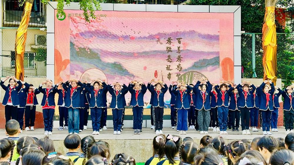 最后一幕“手势舞共情”,全班同学整齐列队,双手比划出“心”“家”“孝”等形象手势,配合歌词“天地恩情永难忘,心中扎下根……”同步律动。统一的动作、真挚的眼神,让“敬老”从舞台延伸到每个人心中,镜头记录下这一温暖瞬间。3此次风采展示,五年级(7)班用创新形式让《中华孝道》焕发新活力,不仅展现了班级团结向上的精神风貌,更将“敬老润心”的种子深植于学生心田。作为育人阵地,温江区东大街一小始终致力于传承中华优秀传统文化,通过多样化的实践体验活动,引导学生感悟孝道真谛、践行文明风尚。本次展示正是学校德育工作的生动缩影,彰显了以文化人、以德润心的办学理念,让传统美德在新时代少年身上绽放光彩。