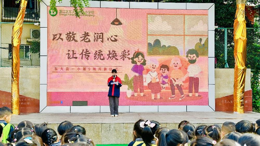 岁岁重阳,今又重阳。10月27日,温江区东大街一小全体师生齐聚绿茵场,举行第九周升旗仪式。五年级(7)班以“以敬老润心 让传统焕彩”为主题展示班级风采,通过舞蹈、朗诵、手势舞“三幕式”形式演绎《中华孝道》,让传统美德在灵动表演中深入人心。