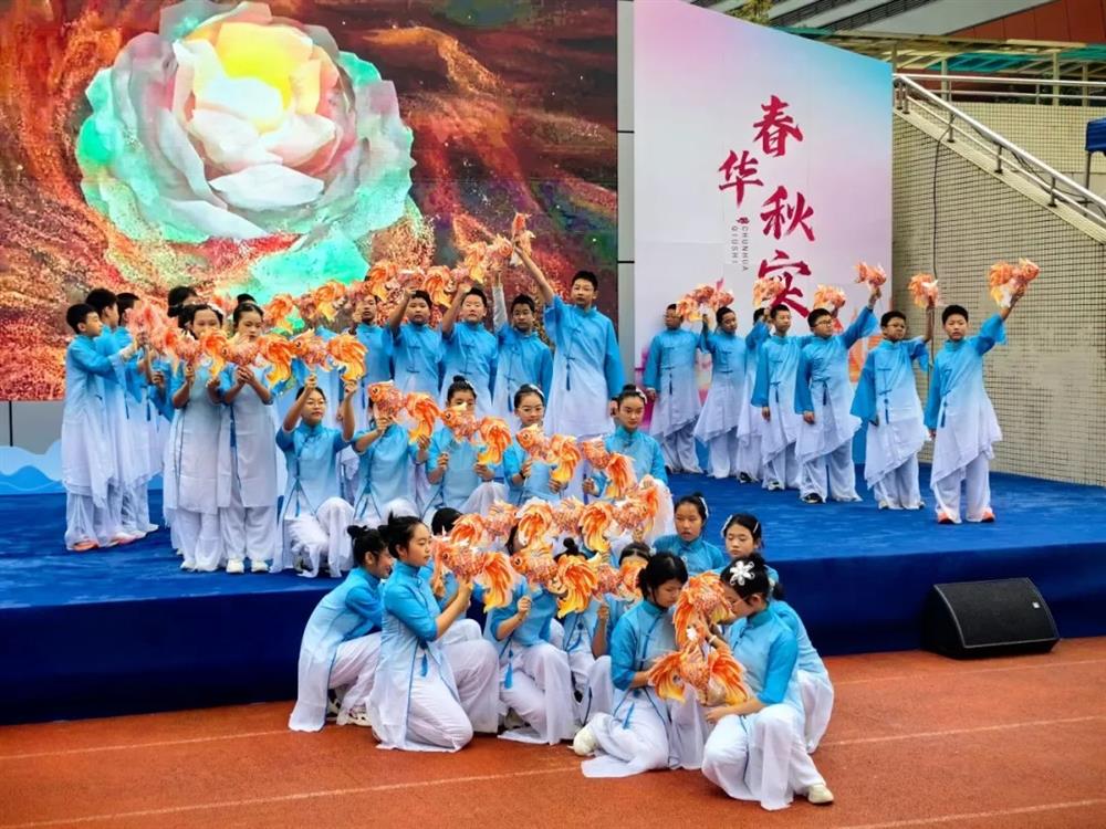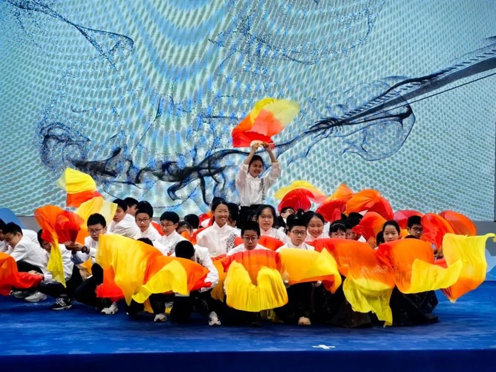 七年级的表演式入场最为惊艳。同学们以青春之姿,演绎古老传说:激昂鼓点敲响“秦王破阵”的雄浑气概,翻飞彩扇绘就“千里江山”的壮丽画卷。这场融体育、艺术与传统文化于一体的视觉盛宴,不仅是对主题的完美诠释,更让全体师生在美的享受中增强了民族自豪感。