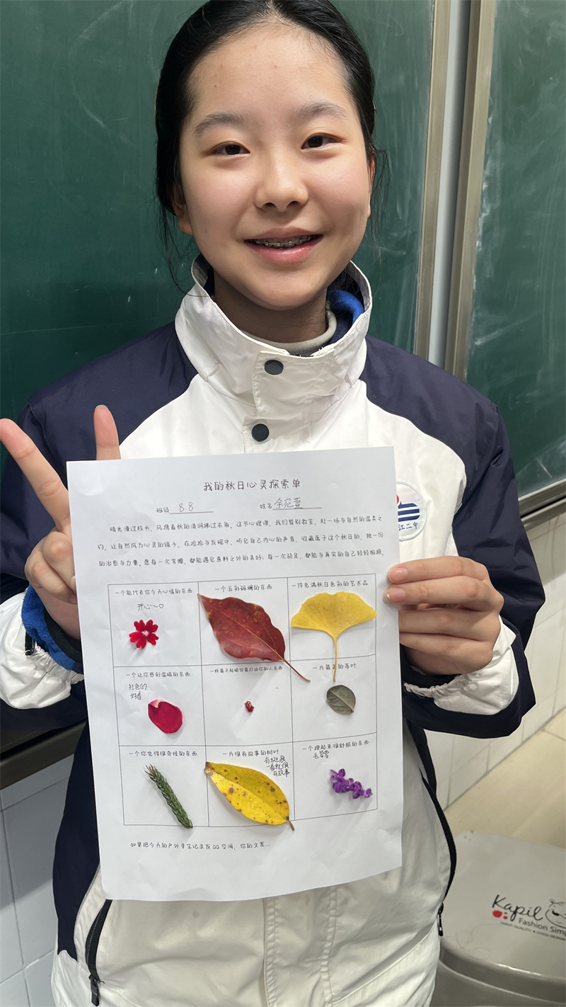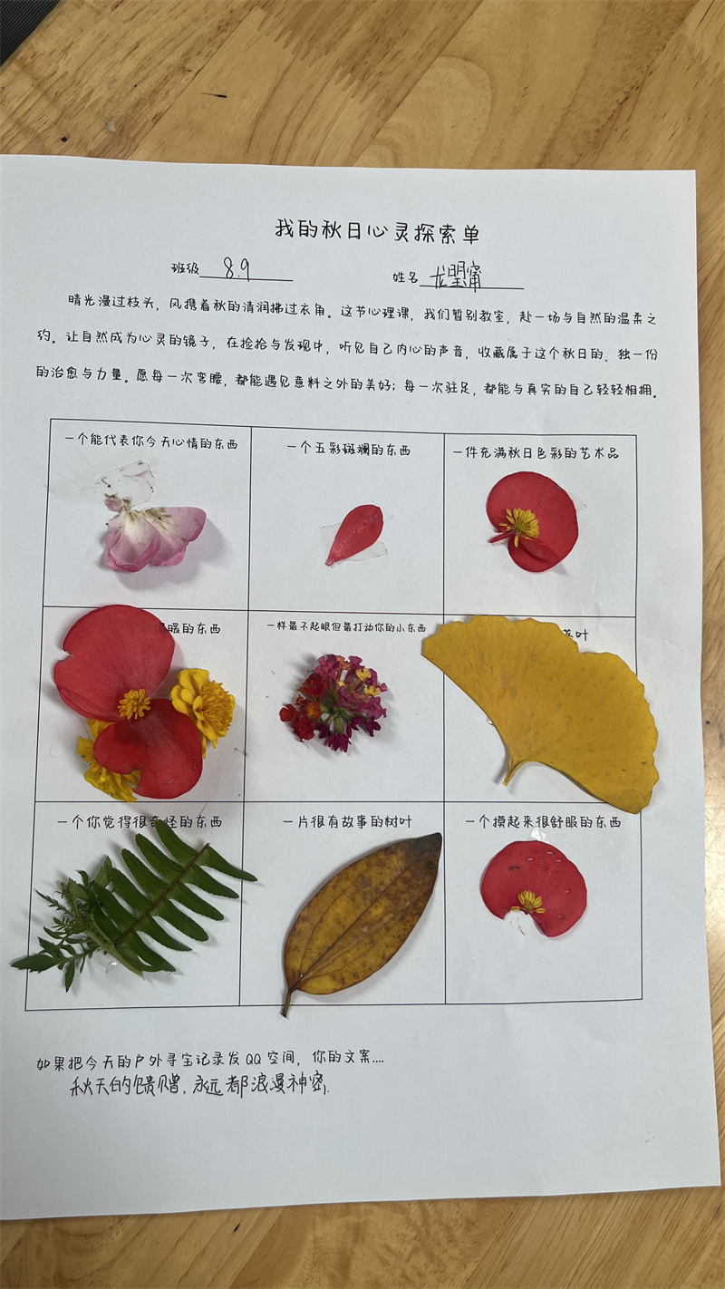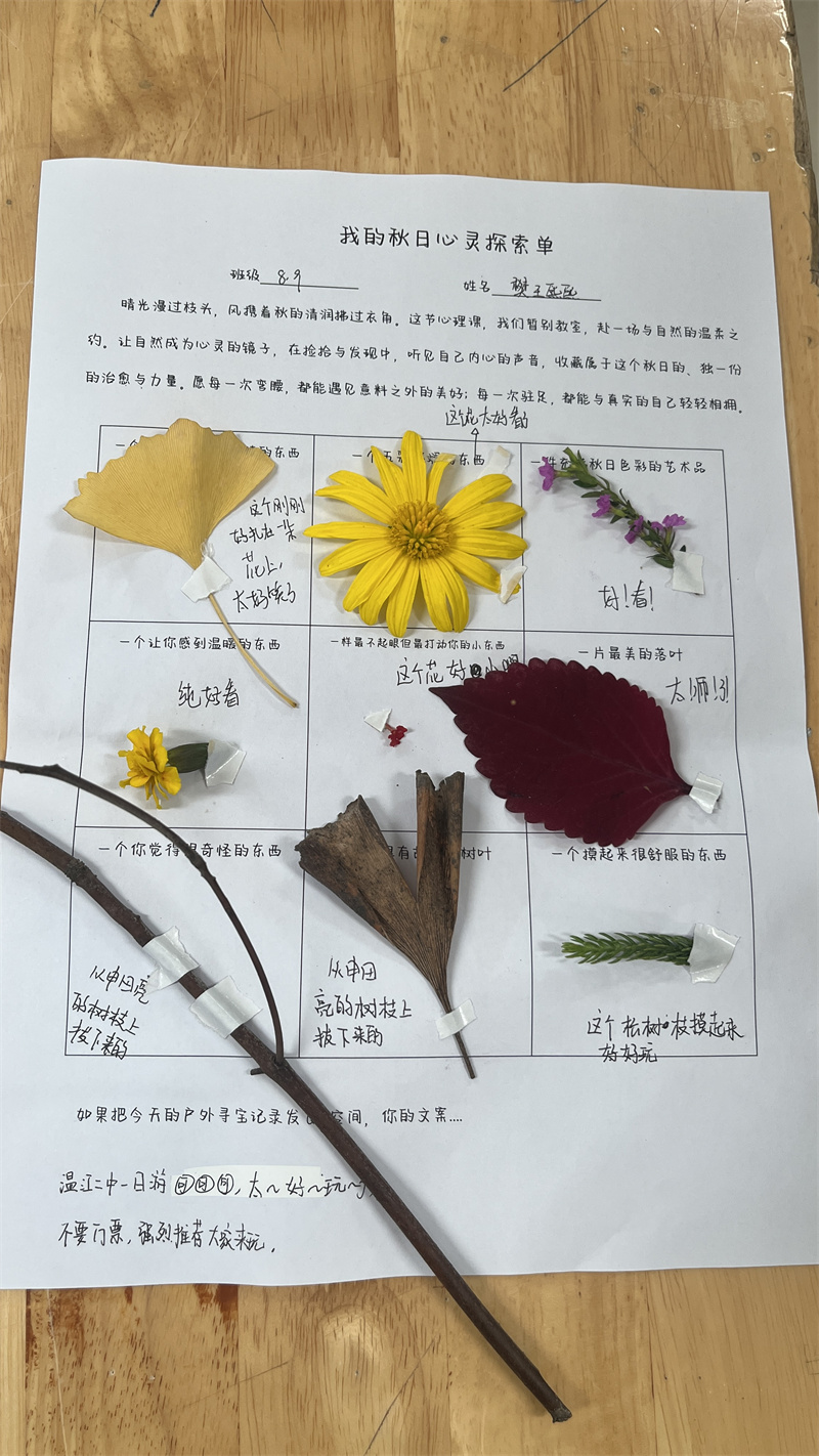 同学们在校园中细致寻找,用自然之物填写探索单。探索归来,同学们将秋天的馈赠精心贴于探索单上。一片落叶、一颗石子、一瓣落花,都被赋予独特的意义,成为情绪的载体与故事的记录。