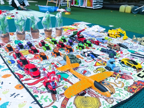 在孩子和家长们的期待中,跳蚤市场就要开始了!“小老板”们带着大包小包的货物进入跳蚤市场,紧张且有序地布置班级的小摊位。他们互相帮忙、轻声商量,在协作中学习礼貌与互助。不一会儿,琳琅满目的小摊陆续就位,每一件物品都被整齐摆放,仿佛在静静等待那个懂它的新主人。